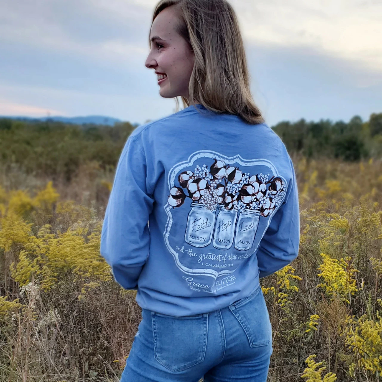 Hand-drawn mason jars and cotton blossoms with “Faith, Hope and Love and the greatest of these is love….1 Corinthians 13:13” on a super comfy shirt. The perfect blend of Southern Charm and God’s word.