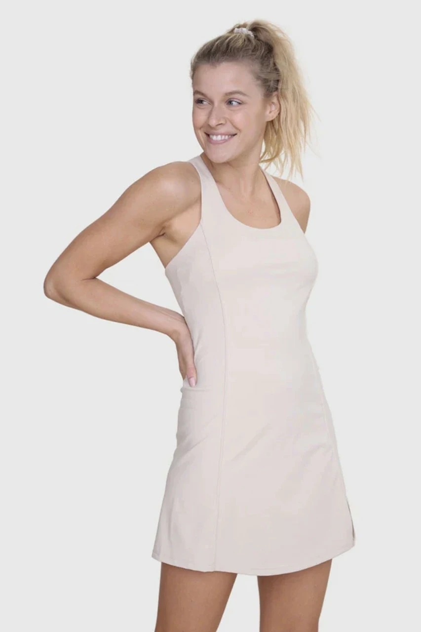Made for movement, this active dress has a classic scoop neckline, a small side slit, an inner mesh layer in the chest area, and twin racerback straps for extra breathability and mobility.