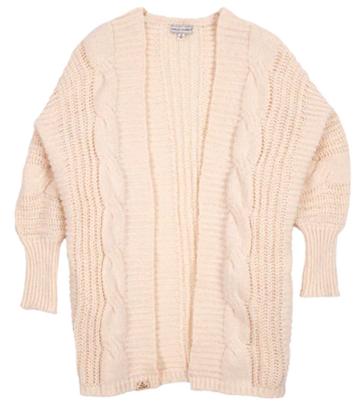 Soft and cozy knit cardigan with ribbed wrists and a cable braid design.