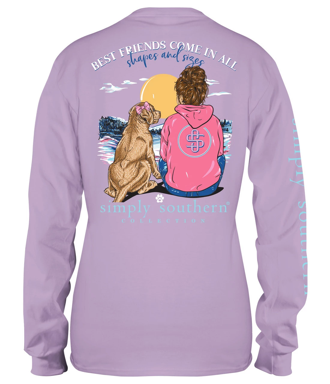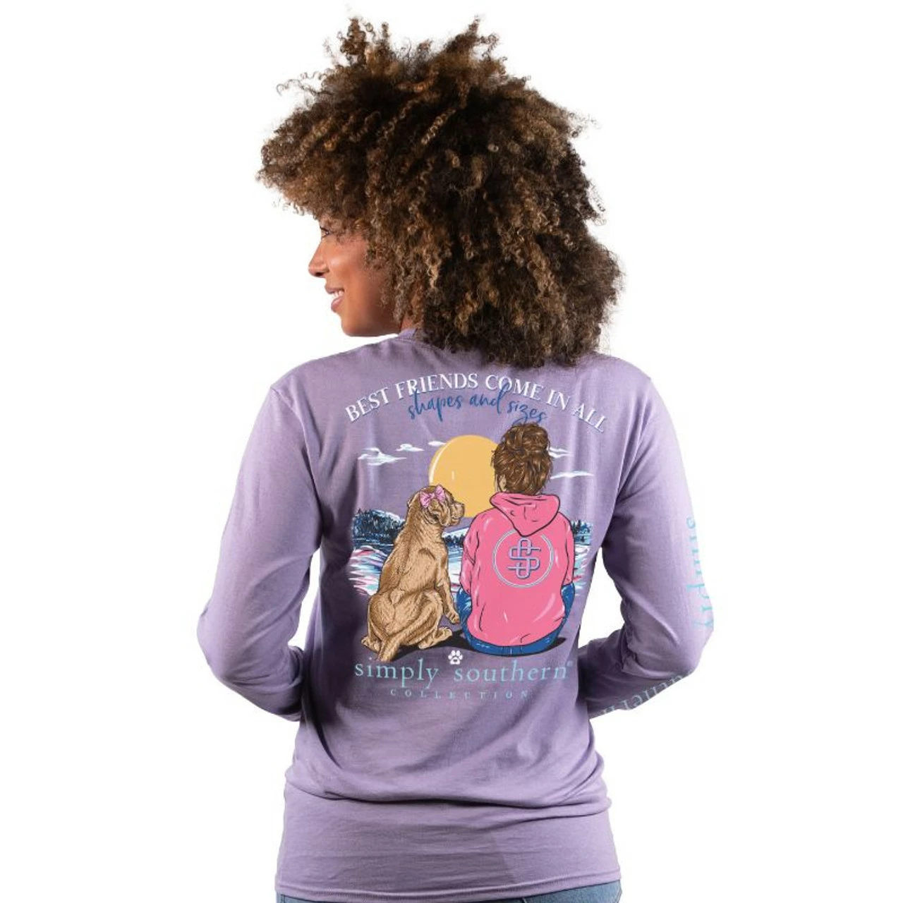 Lilac purple long sleeve shirt with a woman and her dog looking toward the horizon and the phrase BEST FRIENDS COME IN ALL SHAPES AND SIZES. Simply Southern logo below, on left chest, and right sleeve. Pre-shrunk and ring-spun 100% cotton. Unisex sizing.