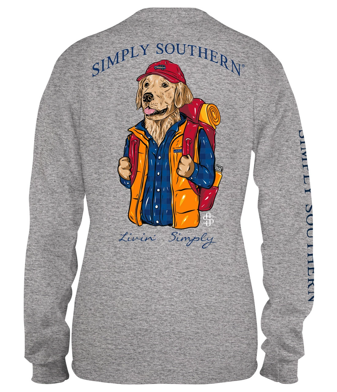 Heather gray long sleeve shirt with a dog in hiking attire and the phrase LIVIN SIMPLY. Simply Southern logo below, on left chest, and right sleeve. Pre-shrunk and ring-spun 100% cotton. Unisex sizing.