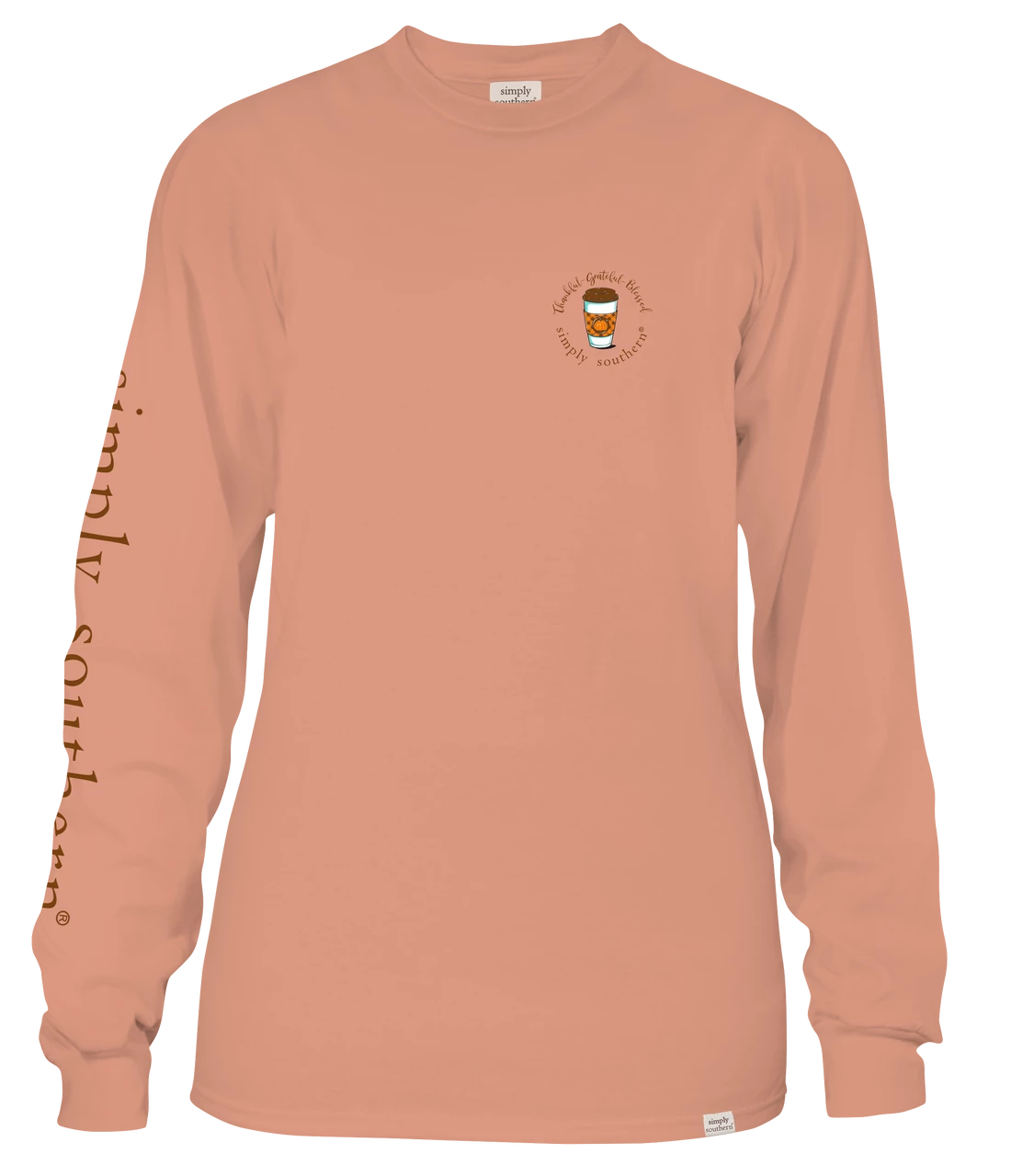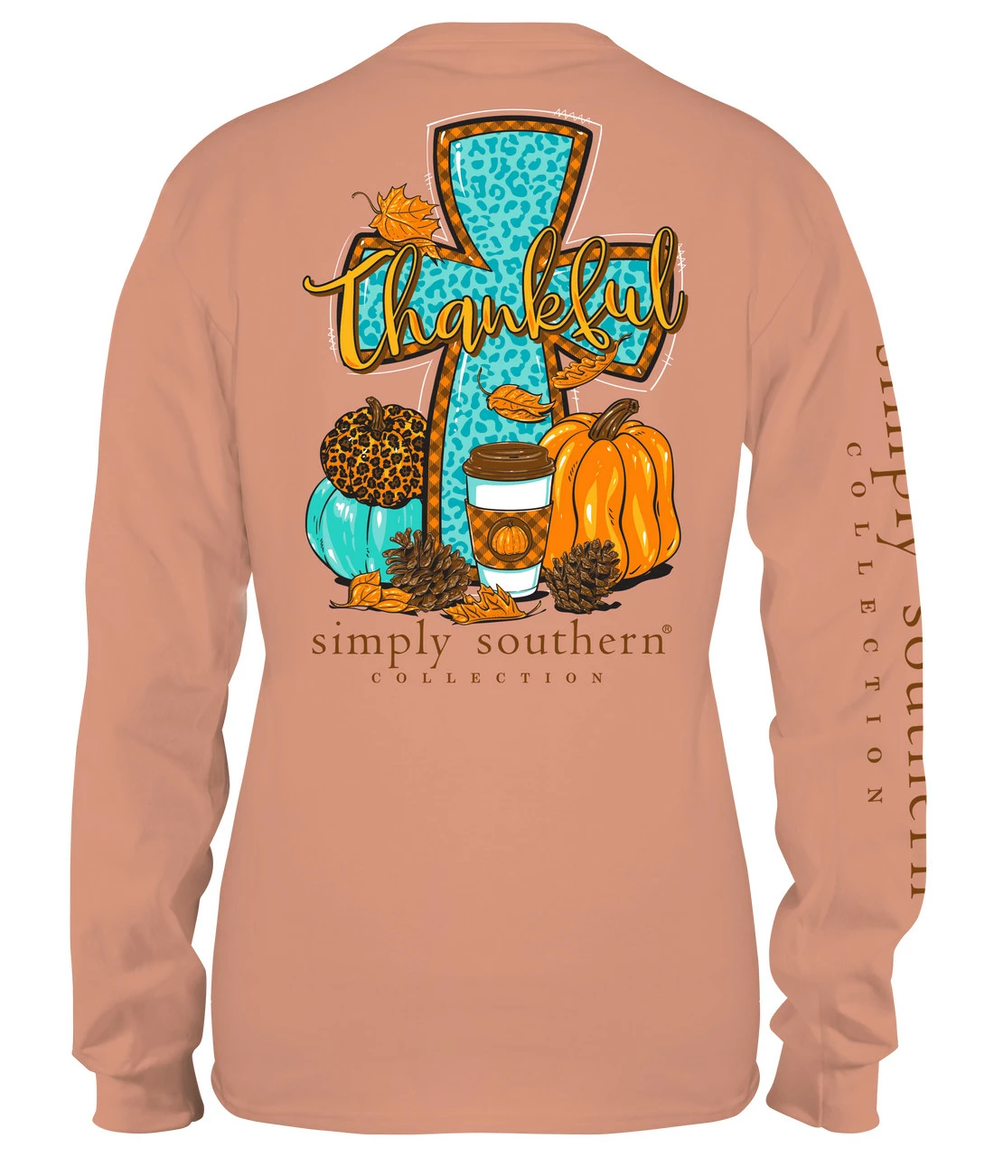 Cafe light brown long sleeve shirt with a blue leopard patterned cross with leopard patterned; orange; and blue pumpkins and a coffee cup; the phrase “”Thankful””; and the Simply Southern logo on the back. A coffee cup and the pharse “”Thankful grateful blessed”” with the Simply Southern logo on the front chest. The Simply Southern logo along the right sleeve. Pre-shrunk and ring-spun 100% cotton with ribbed crew neckline. Unisex sizing.