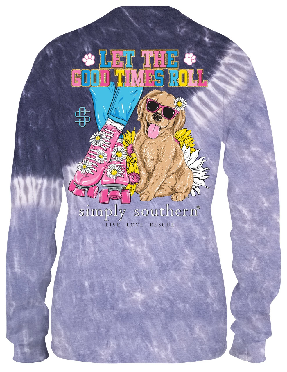 Blue tiedye long sleeve shirt with the phrase LET THE GOOD TIMES ROLL in multicolored letters outlined in glitter. Below is a puppy in sunglasses sitting beside a crossed pair of legs in skates. The phrase LIVE LOVE RESCUE is below. Simply Southern logo below and on left chest. Pre-shrunk and ring-spun 100% cotton. Unisex sizing.
