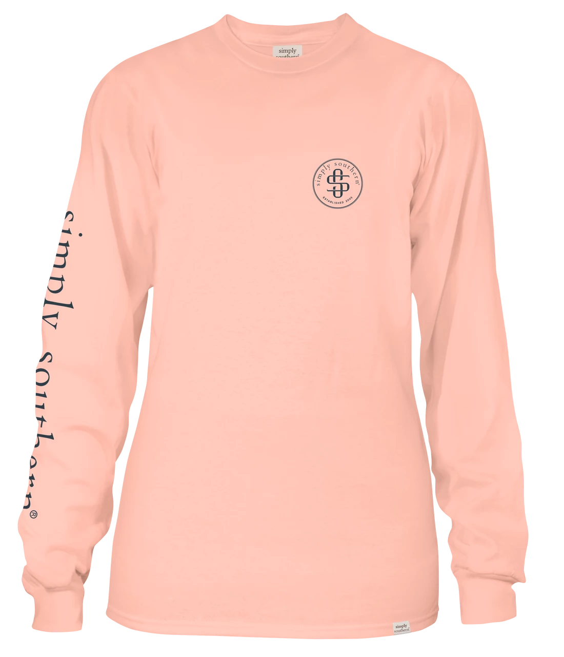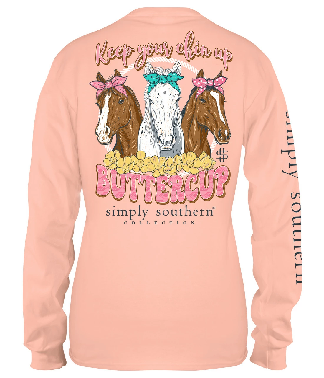 Reef pink long sleeve shirt with three horses wearing spotted bandanas and the phrase KEEP YOUR CHIN UP BUTTERCUP. Simply Southern logo below, on left chest, and right sleeve. Pre-shrunk and ring-spun 100% cotton. Unisex sizing.