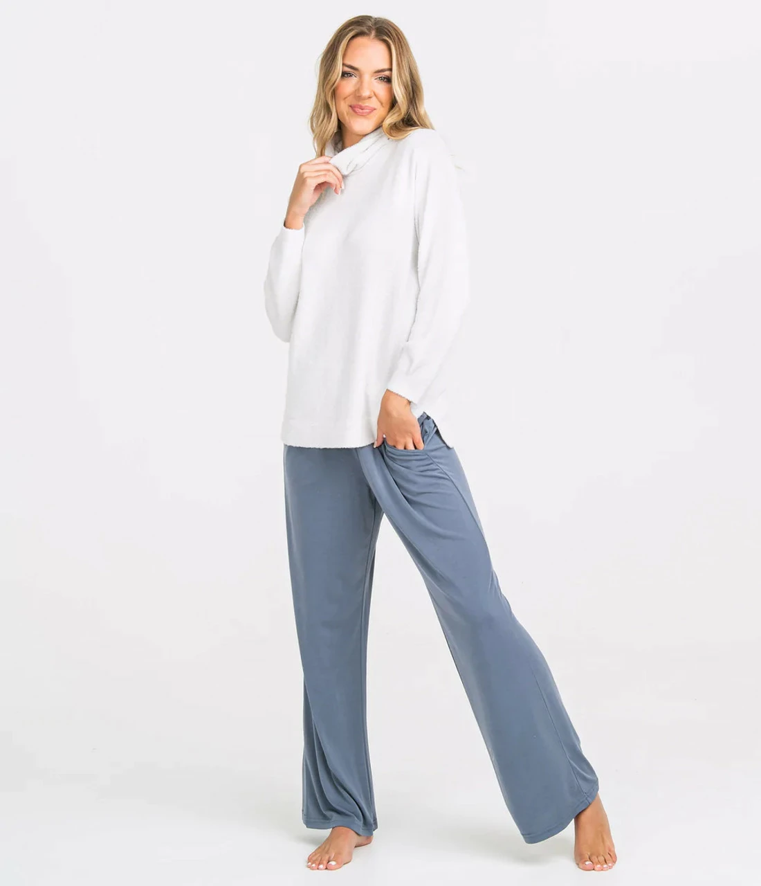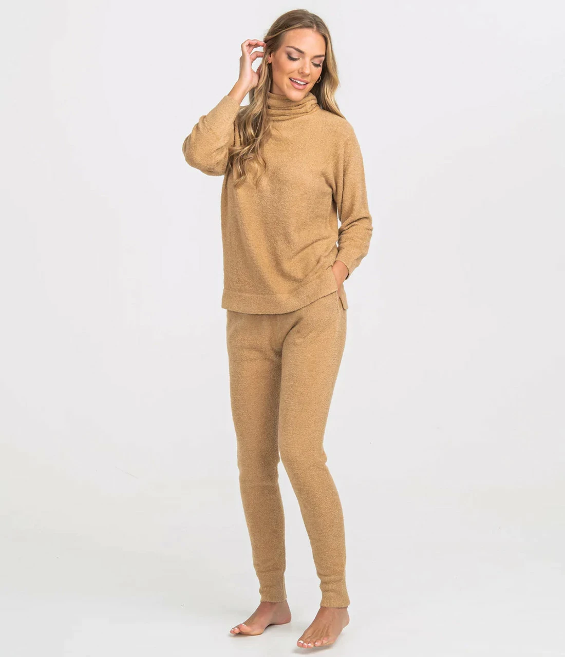 The MUST HAVE fabric of the season – Dreamluxe Knit! We’re calling it now, Dreamluxe will be your newest obsession. The wispy brushed sweater knit is out of this world comfortable and can be worn out and about or as loungewear/sleepwear. Most importantly, itβs stretchy and easy to mix nβ match so just go ahead and grab all the colors and patterns so you can rotate. The Dreamluxe Turtleneck Sweater is the perfect mix of chic and casual. Itβs loose and comfortable fitting while also versatile enough to be dressed up with leggings or any of your favorite bottoms.