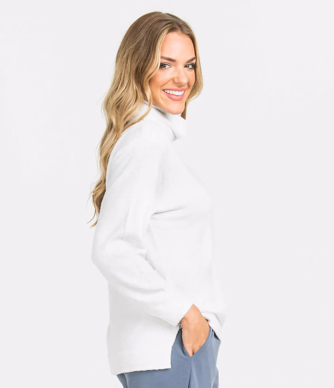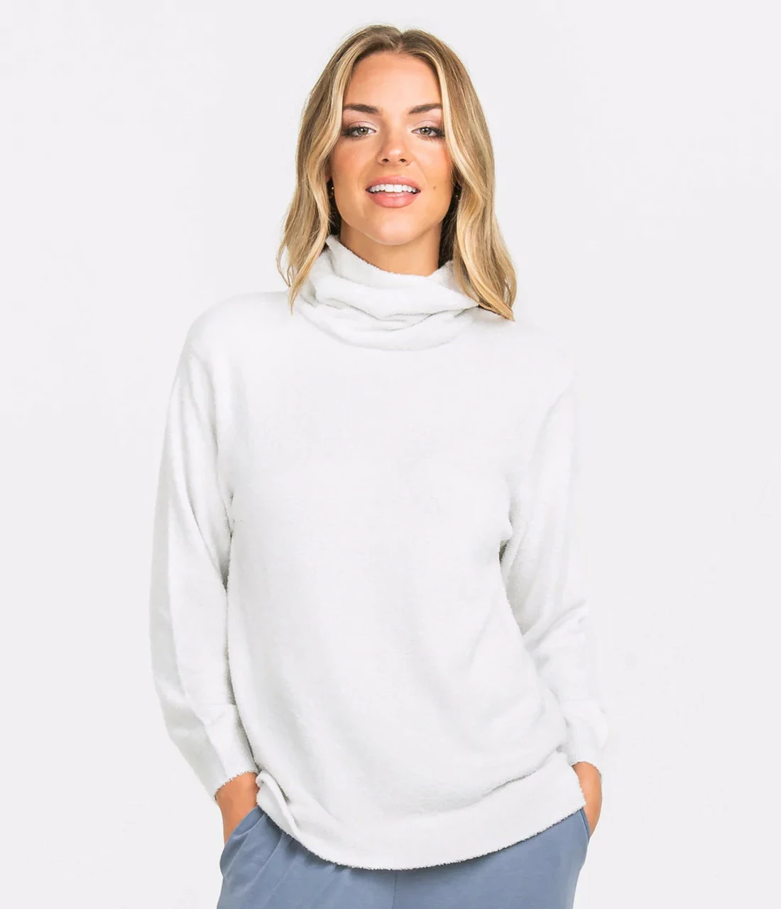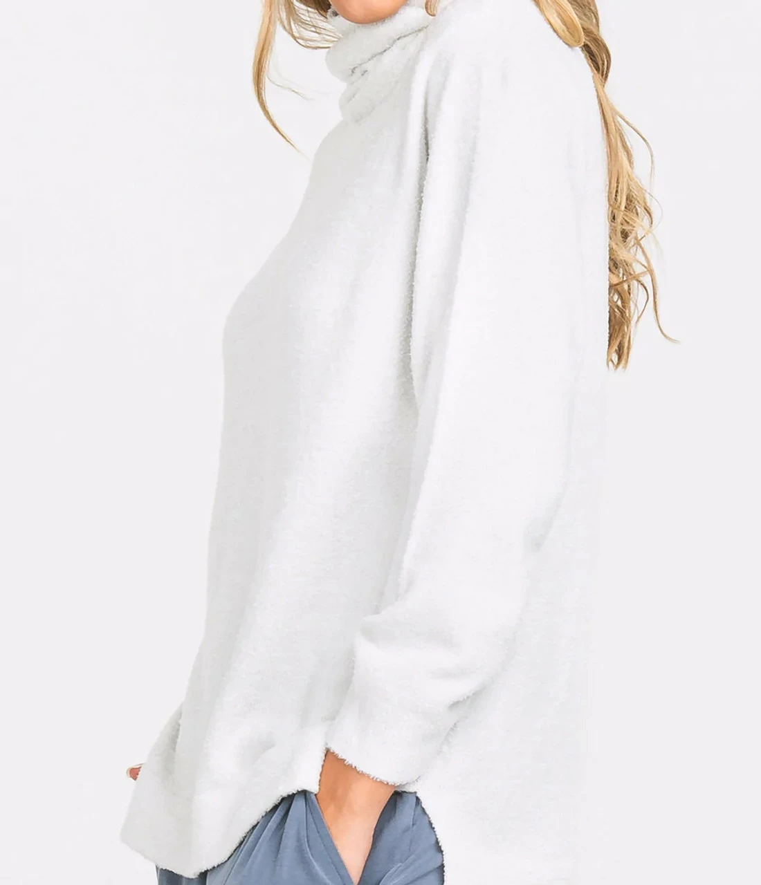 - Fuzzy and plush roll-neck sweater silhouette