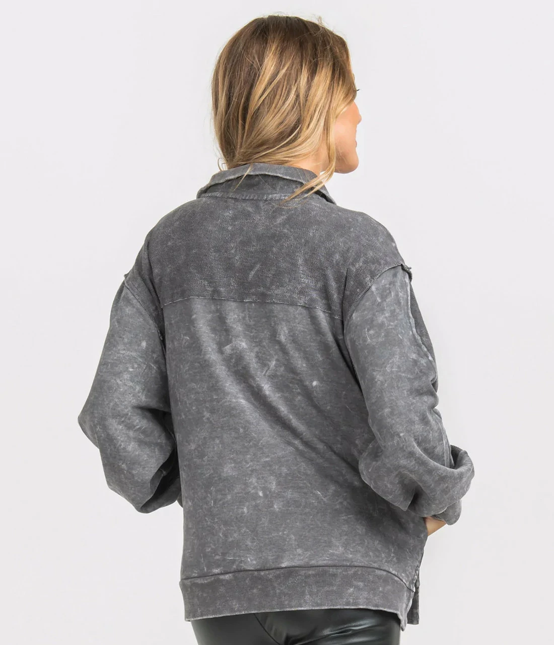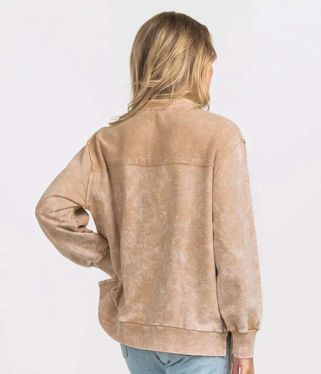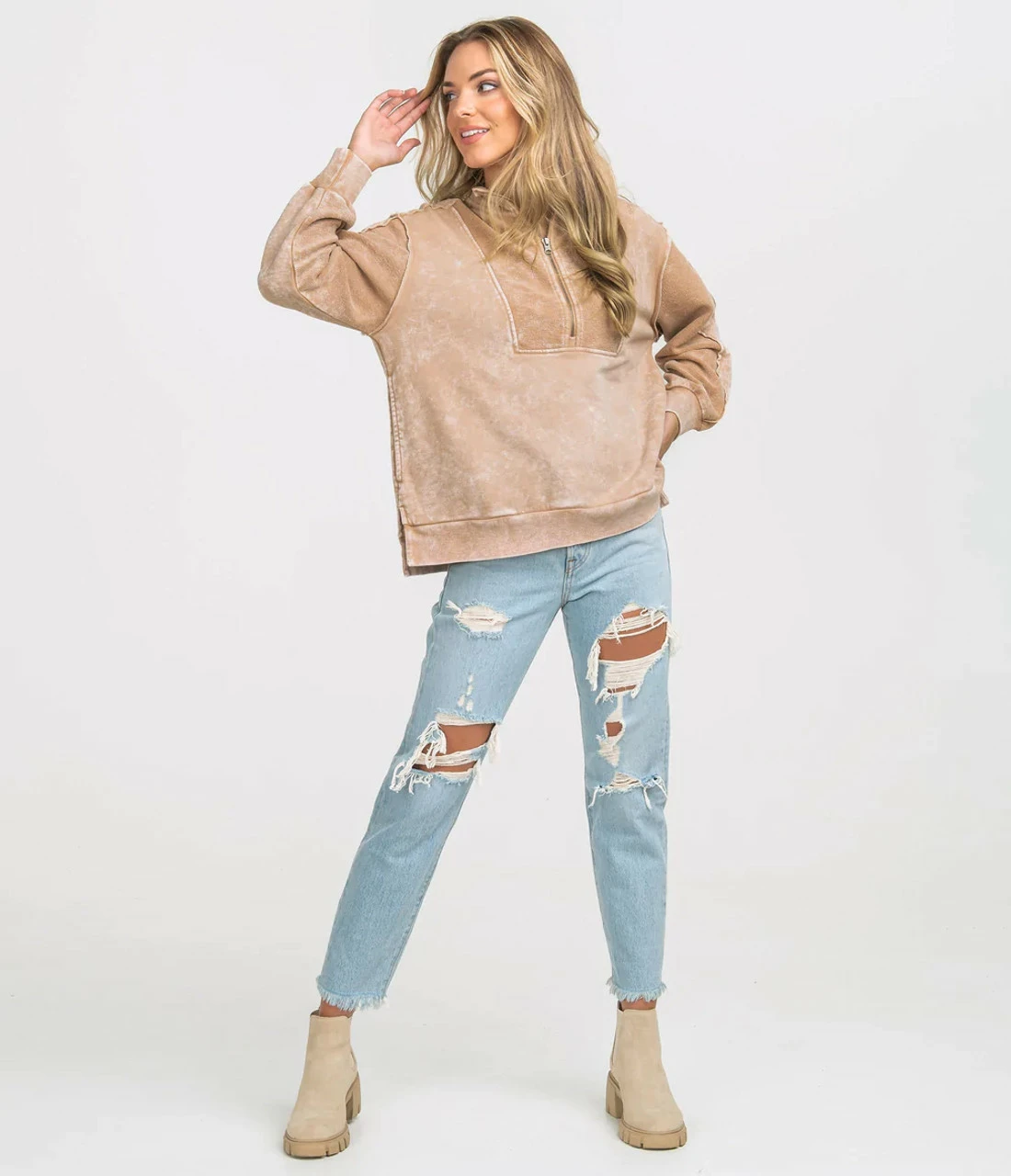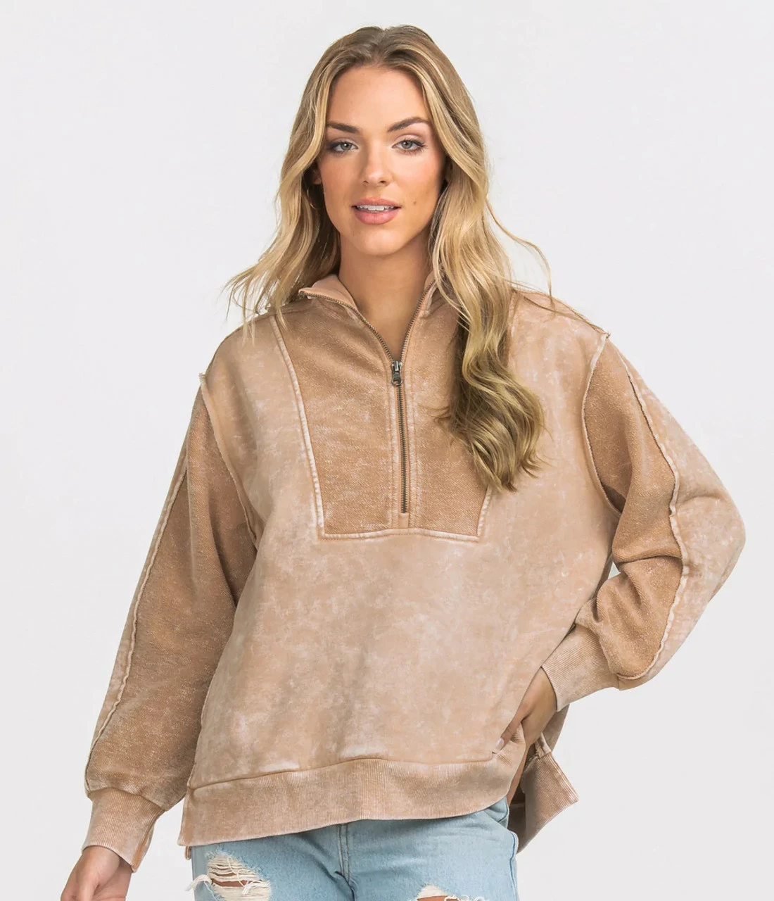 This style was inspired by our love of vintage washes and classic cotton terry. We wanted to highlight the fabric by applying it in color blocked panels and adding the wash, so while the fabrication is our usual high quality Southern Shirt signature, there is visual interest added to elevate the plain terry quarter zip. The slightly longer length and split hem make it ideal for a classic fall fit with leggings or jeans. Those looking for vintage washes will like this one! Oh, and did we mention thereβs a hidden kangaroo pocket!?