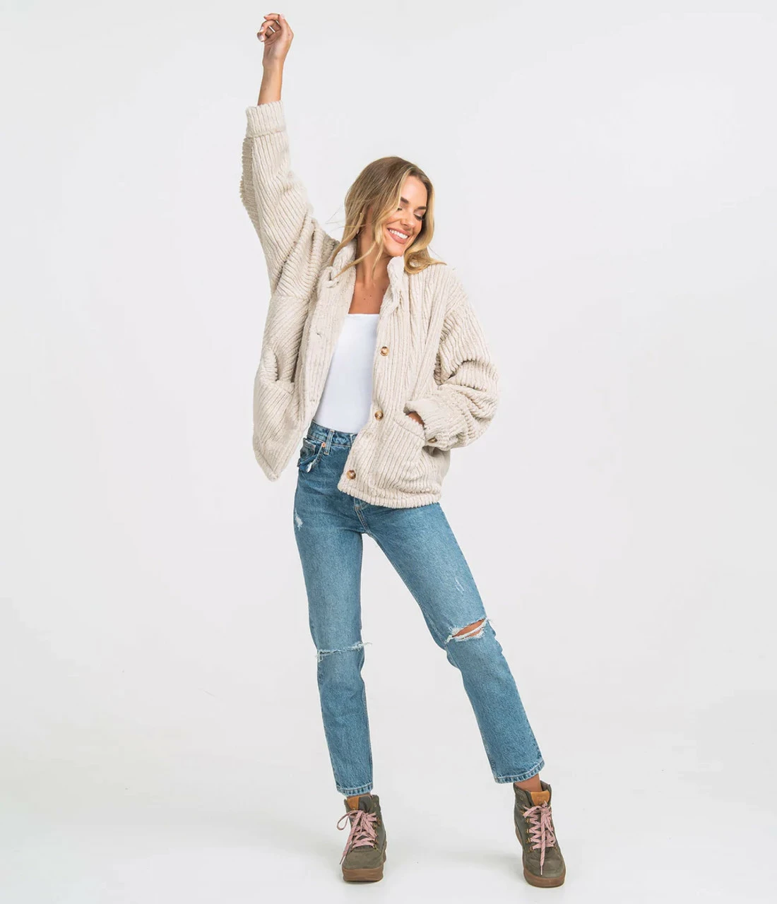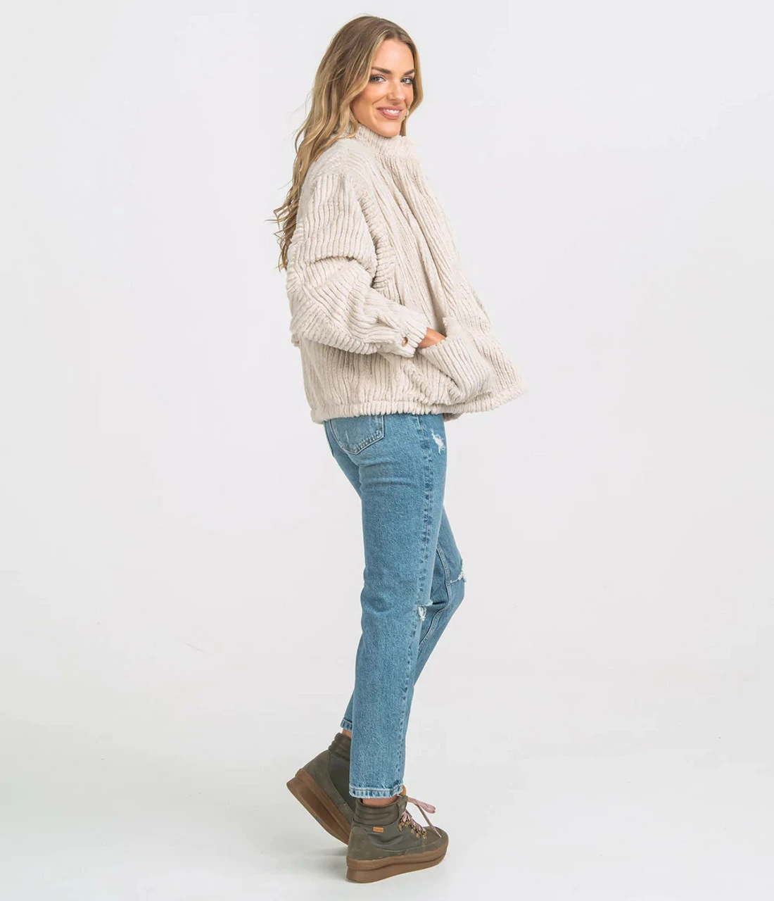 Not only is this upgraded sherpa the most luxurious jacket weβve ever created, it managed to shut down the entire SSCO production department for at least an hour while everyone gathered around the first shipment to take turns rubbing the custom pile faux fur on their faces. Is this your typical fleece jacket you ask? Absolutely not. Are those pockets you see? Duh. Can you imagine yourself waltzing down the city sidewalk at night under the soft glow of the streetlights? Please do. The cut pile texture is custom and unique, an unexpected update to other βsherpaβ styles. It also has center front buttons instead of zippers, with a covered placket and mockneck that looks very elevated when dressed up. Now quit reading this and manifest that chic vision in your head.