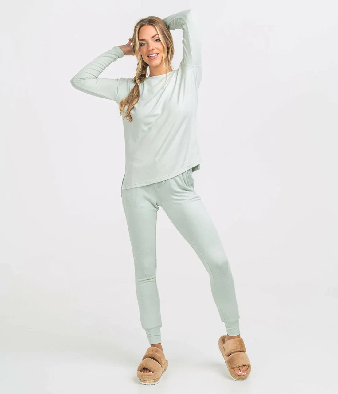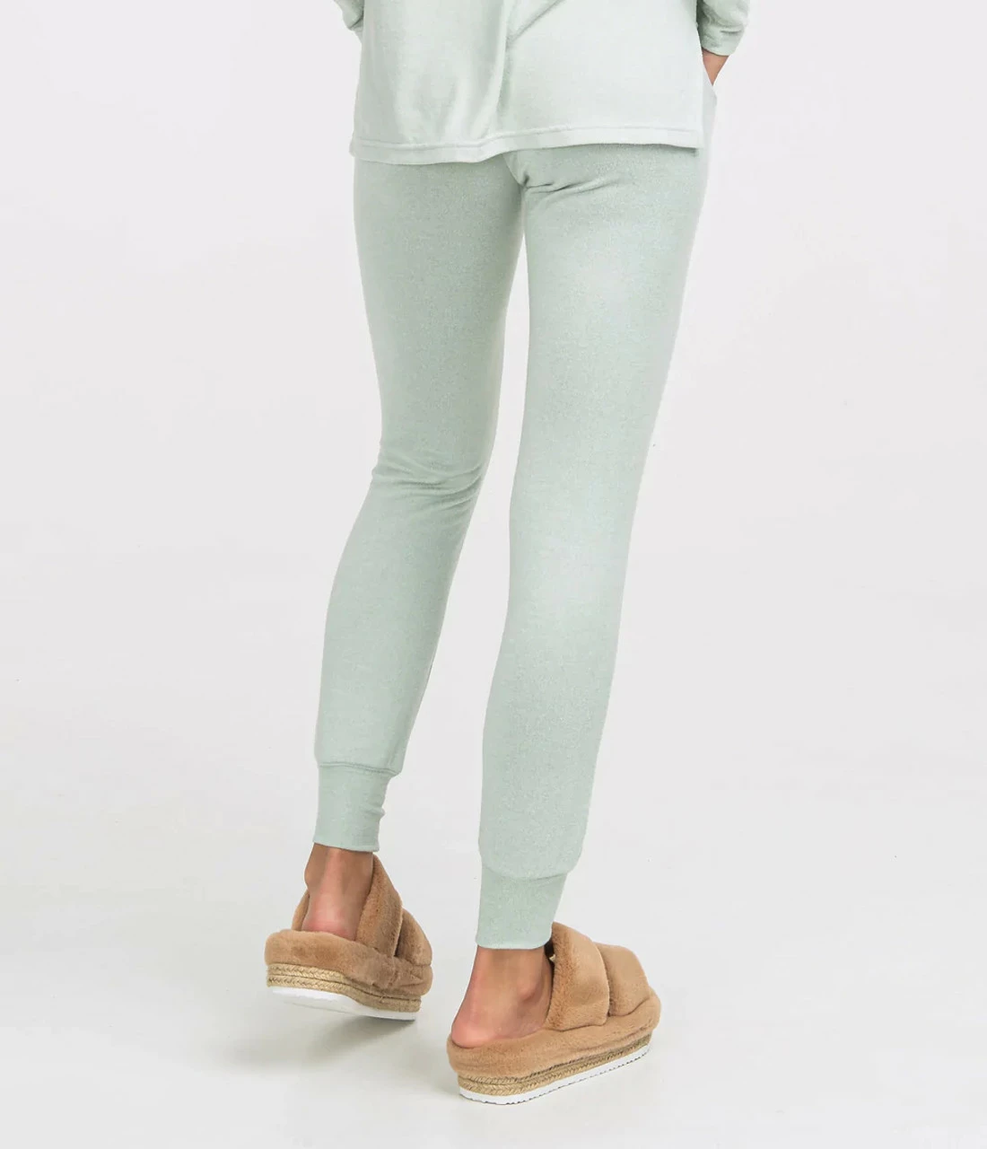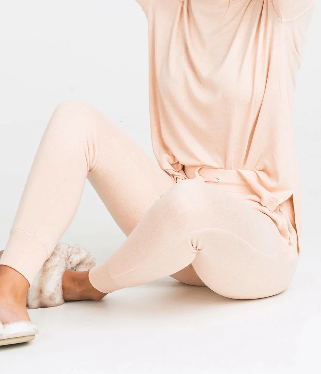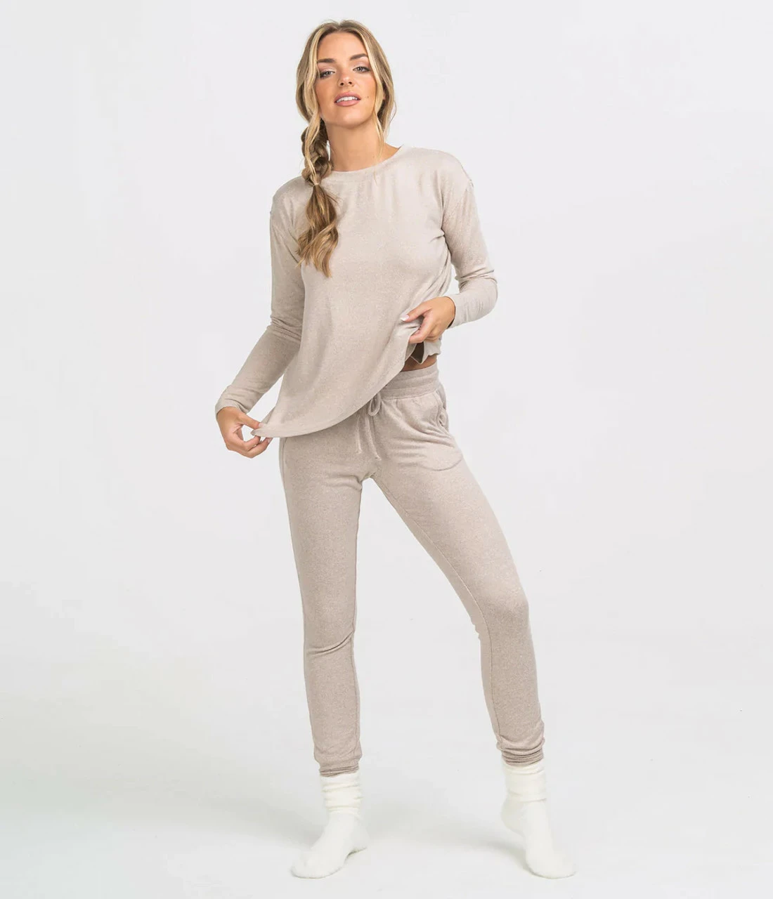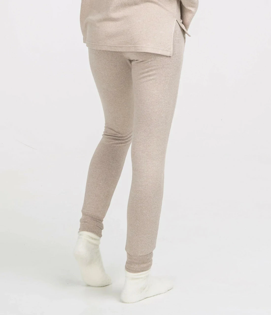 - Double-sided heathered brushed fleece knit.
